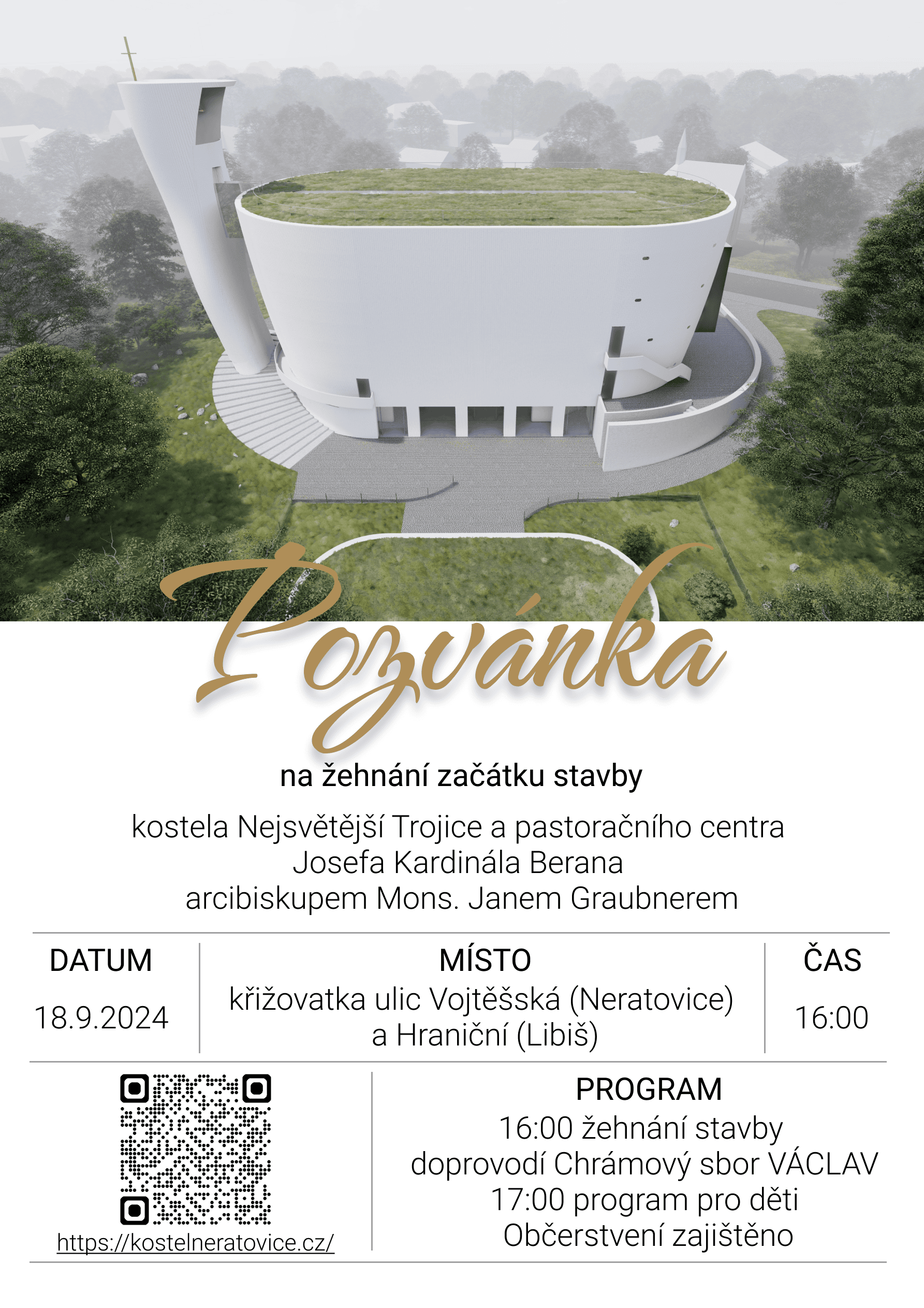 Stavební stroje na pozemku pro komunitní centrum v Neratovicích jedou na plné obrátky, a proto chystáme velkou slavnost, kde chceme naše dílo spolu s vámi svěřit Bohu do rukou. Dne 18. 9. 2024 v 16:00 požehná stavbě kostela Nejsvětější Trojice a pastoračního centra Kardinála Josefa Berana pražský arcibiskup Jan Graubner.