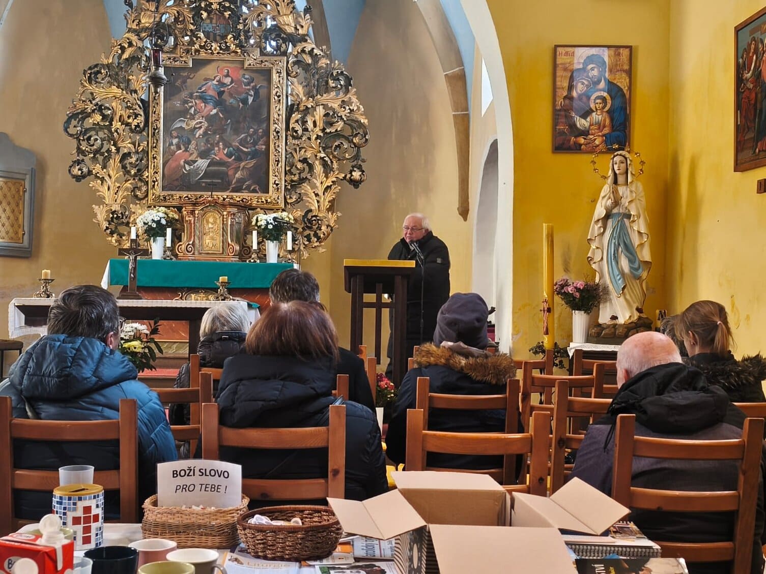 Kromě finanční podpory, tisku propagačních materiálů a jejich distribuci všude, kam se dostane, se včera 23. 11. 2025 za námi přijel i podívat. Sloužil nejdříve mši svatou pro farníky (a za farníky a dobrodince) v Lobkovicích, po obědě s panem farářem se vyrazil podívat na samotnou stavbu a posléze měl schůzku se členy správní a dozorčí rady v Kojeticích v sídle nadace.